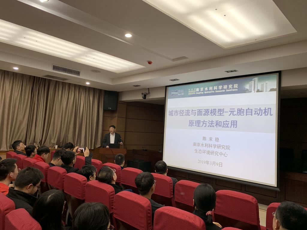 陈求稳研究员做了题为《城市径流与面源模型——元胞自动机的原理方法和应用》的主题报告。陈研究员主要以城市洪涝和城市面源污染为线来介绍元胞自动机模型(Cellular Automaton,CA)。CA模型在城市内涝方面的应用主要是用其模拟城市内涝及人员疏散,陈教授指出,以往做城市内涝模型往往以最短直线距离作为疏散路线,忽略了洪水的流动路线,用CA模型可根据高程判断,在积水较深的低洼地带选择绕行,更利于人员安全到达高地躲避洪水。