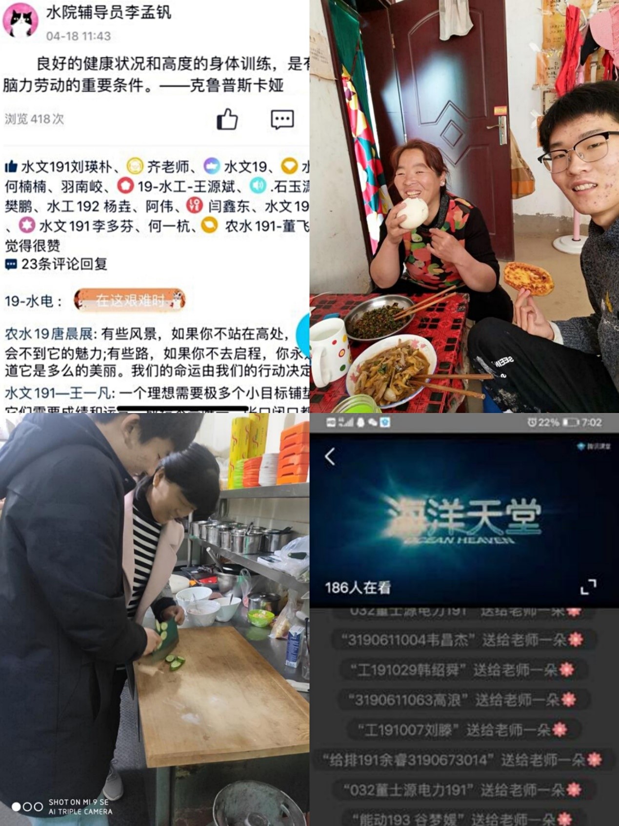 此次心理季活动从多角度、多层次分别开展了如“心随影动”、“温馨一餐”、“星语心愿”、“心灵之窗”等一系列活动。通过共同在线看一部电影、为身边的亲人亲手做一顿饭,同学间相互分享近期阅读感悟,大家一起搜集网络“心灵鸡汤”等操作性强、接地气的方式覆盖了每一位同学,同时活动期间辅导员老师还与同学们展开充分的交流,组织同学们之间进行积极的探讨。通过这些活动一定程度上消化了疫情期间的负面情绪,同学们表示会积极响应“停课不停学”号召,努力调整自身心态,与家人多交流、多沟通,以积极、健康、成熟的心态面对生活中的情绪。