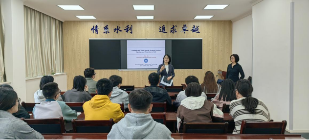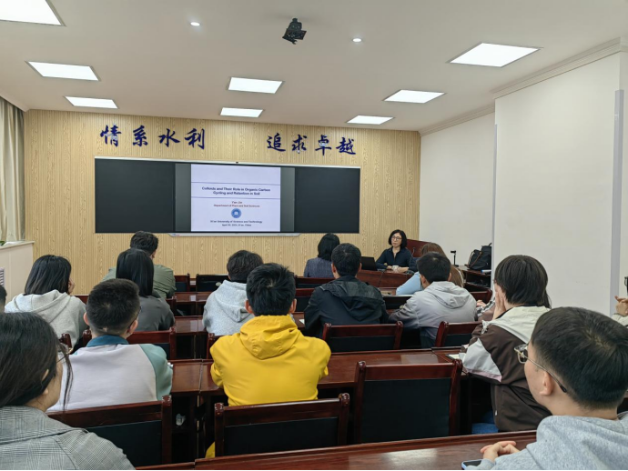 金妍教授为与师生作了题为《胶体及其在土壤有机碳循环和保留中的作用》的报告,报告主要针对土壤中胶体和自然纳米颗粒(NNP)的作用及其与有机碳(OC)的相互作用进行了深入探讨。报告强调了在全球气候变化的背景下,深入理解土壤中胶体和NNP的动态对于有机碳的固定和释放至关重要。报告以问题为出发点,提出解决方案,并展示了科学研究与实际生产的紧密结合,为全球环境保护和可持续发展做出了重要贡献。与会老师和学生们在报告中踊跃参与,踊跃提问,进行深入讨论和交流。