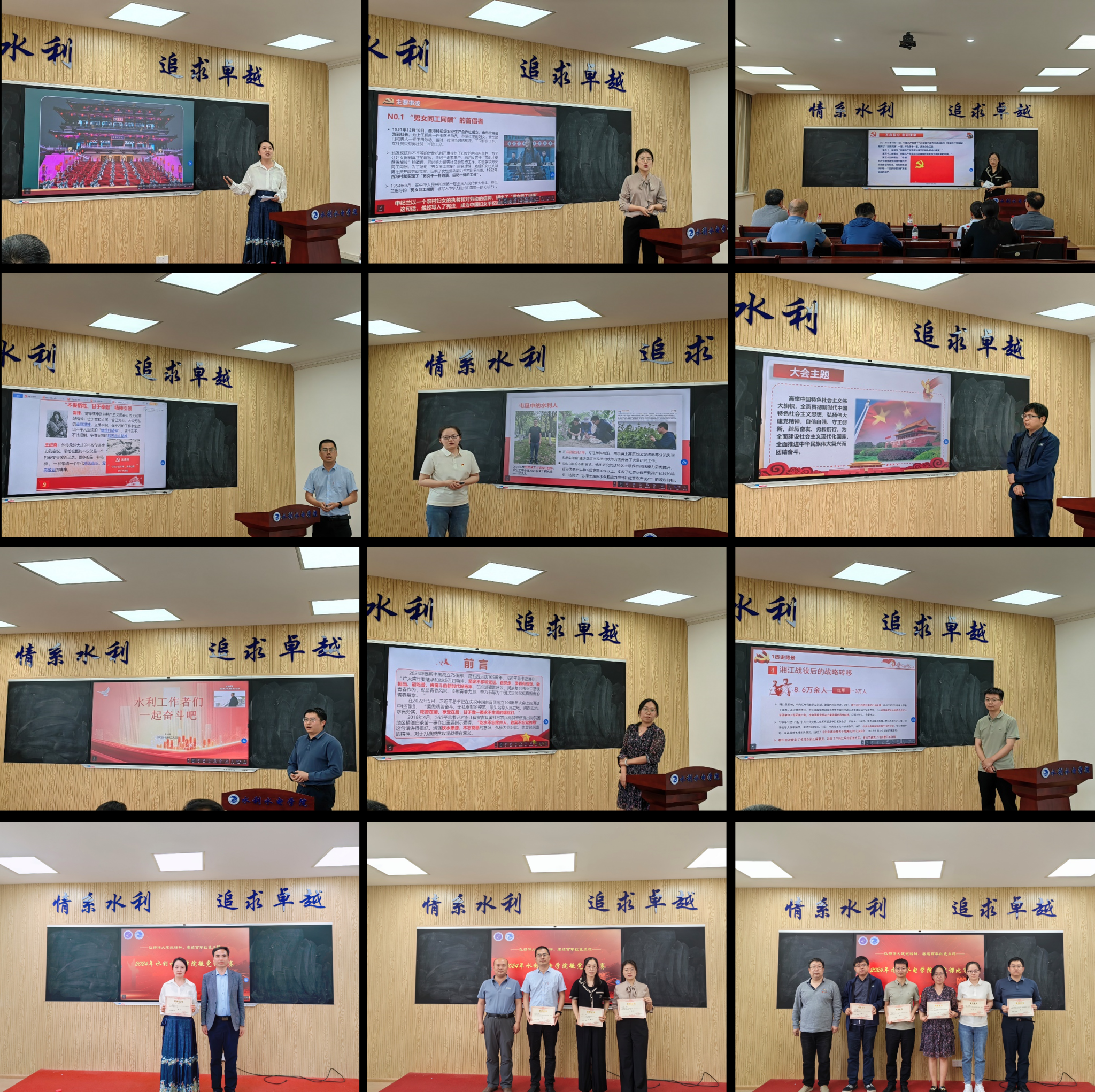 参赛选手以8分钟现场微课的形式,着力讲好党的故事、中国的故事。学工办党支部王倩以“文化自信——因何,为何,又如何?”为主题,以马面裙为切入点,讲述近年来社会热点与中华优秀传统文化的交织碰撞,坚定文化自信是事关国运兴衰、事关文化安全、事关民族复兴。市政系党支部郭媛以第一至第十三届全国人大代表申纪兰个人事迹为背景,讲述了“立场坚定、心系群众、廉洁奉公、奋力开拓、艰苦朴素、淡泊名利”的纪兰精神内涵,号召广大党员要听党话,跟党走,坚持忠诚、执着、朴实,树立坚定的理想信念,发扬不懈的奋斗精神,脚踏实地做好每件小事。实验中心党支部杨明阳以水利学科为切入点,通过引入红旗渠、南水北调两个水利工程案例,让主题微党课有深度、有特色,引发在场老师共鸣。