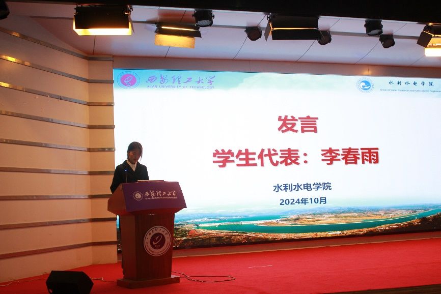 新生代表李春雨同学发言。她表示将学好专业知识,为我国水利事业高质量发展贡献力量。