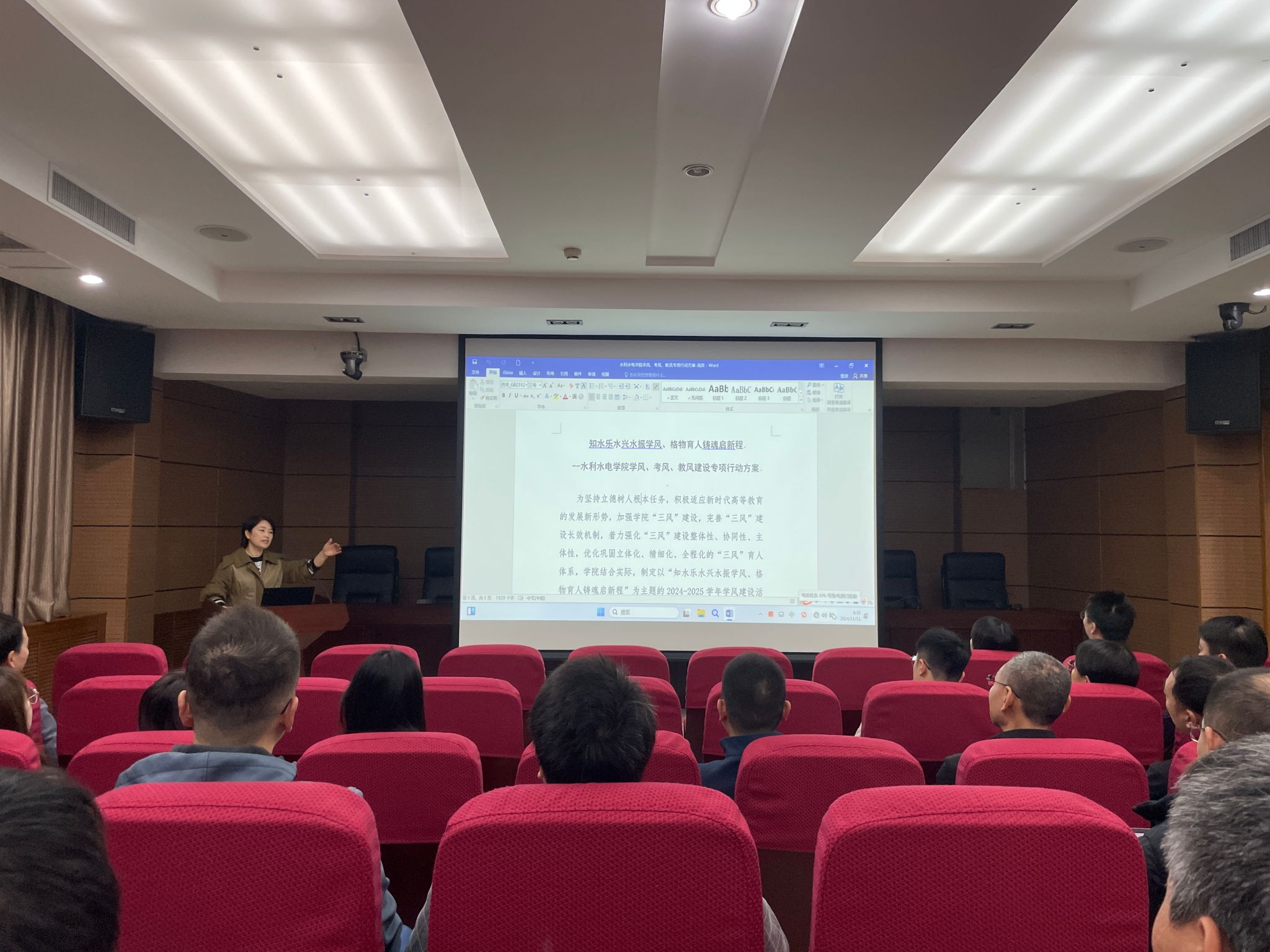 周蓓蓓结合学校有关要求,从学院学风、考风、教风三个方面详细梳理了目前学生和教师在学习、考试和教学过程中暴露的各项问题。并从统一思想认识、开展专题教育、严格课堂管理、加强诚信教育、强化考试管理、提升教学能力、夯实导师责任七个方面对学院“三风”建设专项行动工作方案进行了详细解读。她要求,班级导师和辅导员要扎实做好学生的学业指导和教育服务管理等工作、任课教师要切实提升教学能力和课堂管理、监考教师要严格考试纪律,全方位引导学生树立“情系水利、追求卓越”的远大学习目标、端正学习态度、提升学习动力、提高学习能力。
