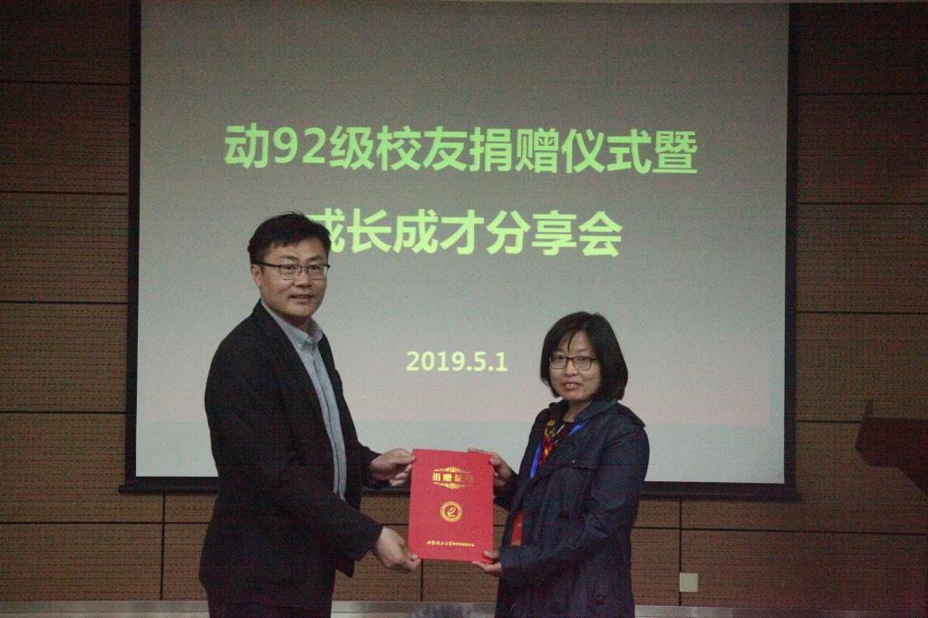 朱中华副处长为动92级校友颁发了捐赠证书。
